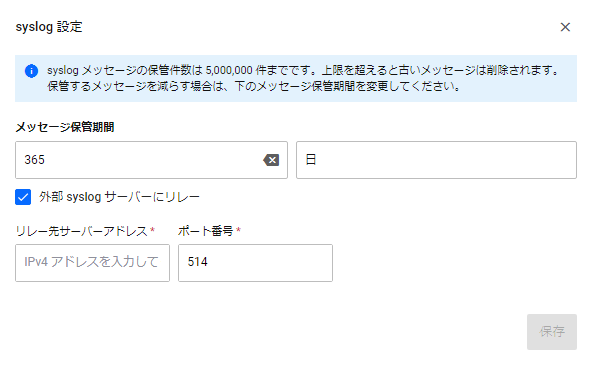 syslog | 保存しているsyslogメッセージに使用している領域の容量を表示します。 |