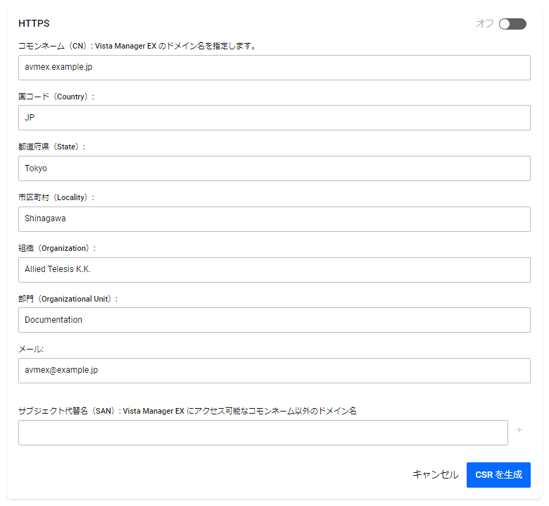 コモンネーム(CN) | AVM EXシステムの証明書に記載するAVM EXサーバーのコモンネームを入力します。 通常は、サブドメインを含めたFQDNがコモンネームとなります。 |