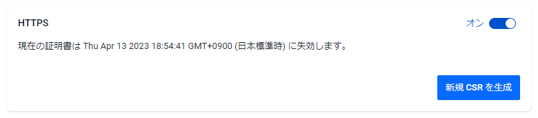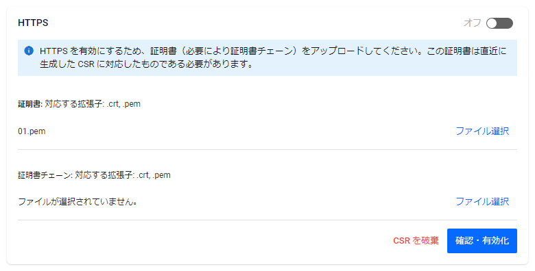 「確認・有効化」ボタン | 直近に生成したCSRとアップロードされた証明書または証明書チェーンを照合し、有効な証明書、証明書チェーンである場合にはHTTPS接続を有効にします。 |