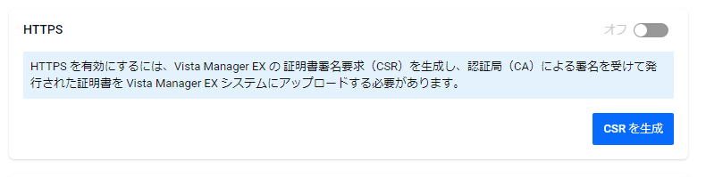 HTTPS | AVM EXシステムのWeb管理画面へのアクセスにHTTPSを使用するか否かを設定します。有効なサーバー証明書が登録されている場合のみ操作できます。 「オン」にすると、AVM EXのWeb管理画面へのアクセスにHTTPSを使用します。 「オフ」にすると、AVM EXのWeb管理画面へのアクセスにHTTPを使用します。 |