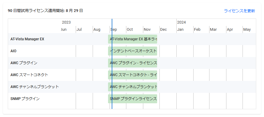また、試用ライセンスが有効な間は各種プラグインやAIO、AWC-CB、AWC-SCなどすべての機能が使用できますが、正規ライセンスを適用後は、試用ライセンスによる有効期限が残っていた場合でも、適用した正規ライセンスに含まれていない機能は使用できなくなります。該当の機能の使用を継続する場合は、正規の基本ライセンスとともにプラグインライセンス、拡張ライセンスを購入するか、別途個別にプラグインライセンス、拡張ライセンスをご購入ください。