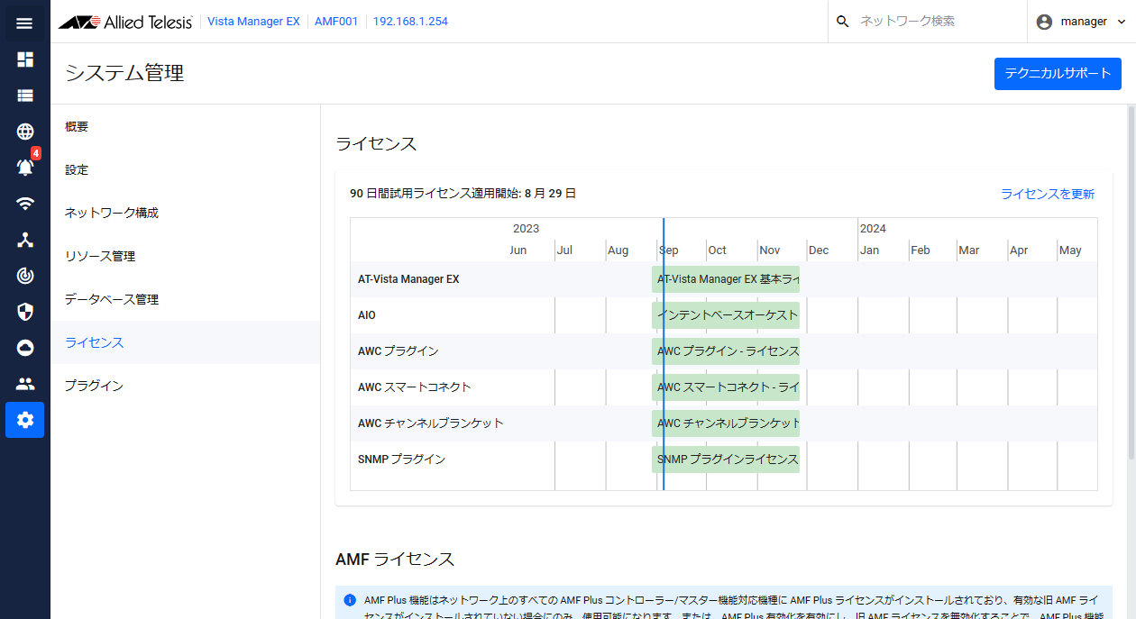 Noteマスター/コントローラーに旧来のAMF(非AMF Plus)ライセンスが適用されている場合は、AVM EXに追加ライセンス「インテントベースオーケストレーターライセンス」を登録することで、AMF Plusの一部機能を含む「Allied Intent-based Orchestrator(AIO)」を使用できます。他社製機器の状態監視機能を使用するには、SNMPプラグインがインストールされている必要があります。なお、マスター/コントローラーにAMF Plusライセンスが適用されている場合は、AVM EXに別売のSNMPマネージャーライセンスを適用しなくても、SNMPプラグインを使用できます。