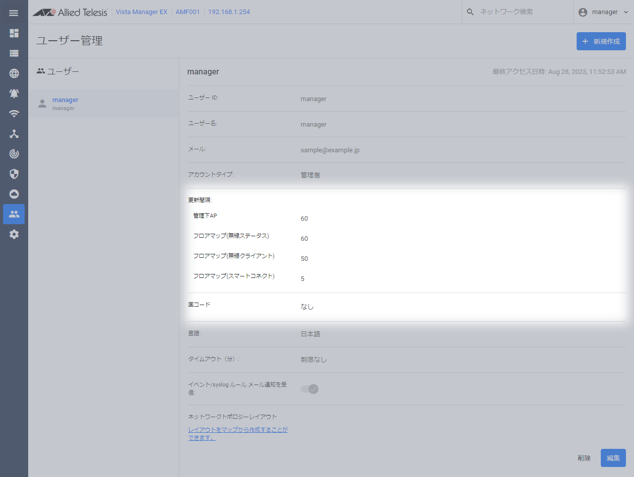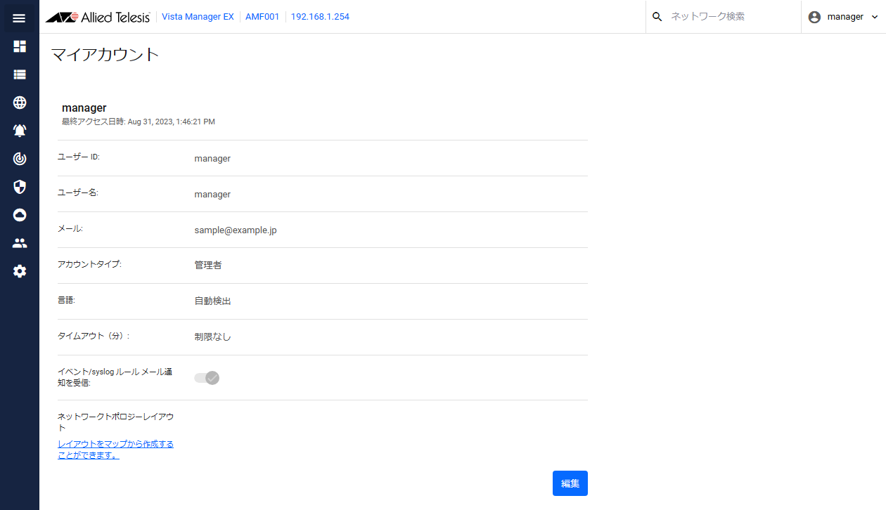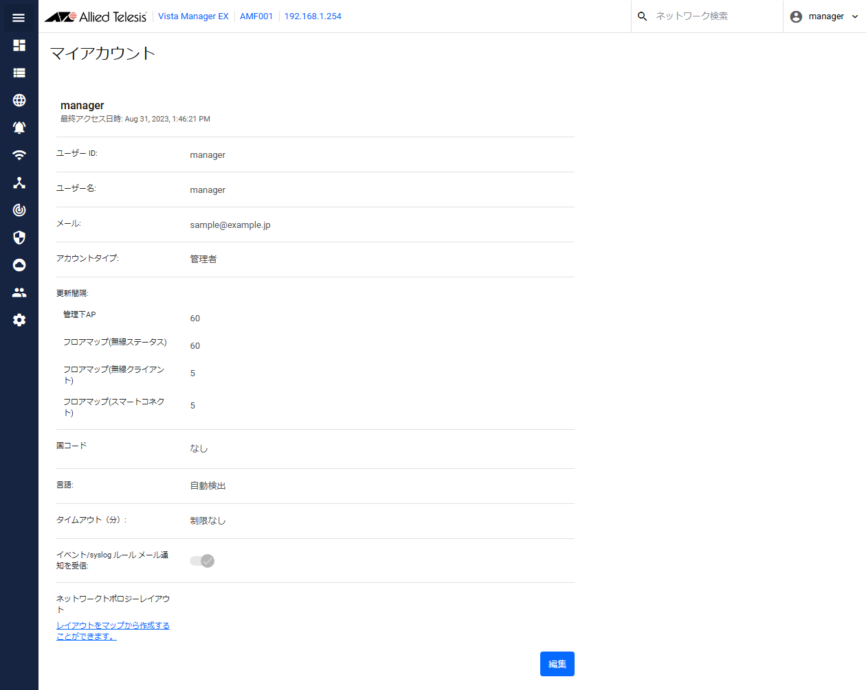「編集」ボタン | AMFネットワークの設定を変更します。NoteAMFコントローラー(またはAMFマスター)に登録されたユーザーアカウントの情報をAVM EXから変更することはできません。 |