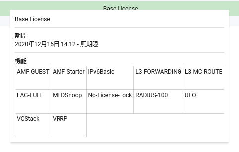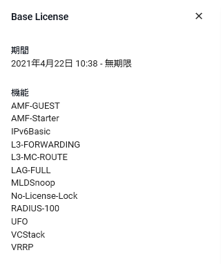 AMF Plus有効化 | 該当のAMF/AMF PlusマスターまたはコントローラーにAMF Plusライセンスと旧AMF(非AMF Plus)ライセンスが両方インストールされている場合に、トグルスイッチでAMF Plusライセンスの有効/無効を表示します。 これらのライセンスが両方インストールされている場合は、デフォルトでは、旧AMF(非AMF Plus)マスターまたはコントローラーとして動作します。 この際、AMF Plus有効化スイッチを「有効」にすることで、AMF Plusマスターまたはコントローラーとして動作させることができます。