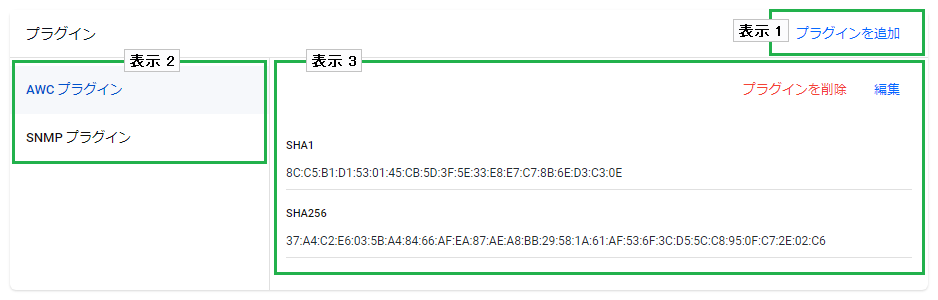 プラグイン証明書フィンガープリント | プラグインサーバーの証明書のフィンガープリントをSHA1、SHA256の各形式で表示します。 |