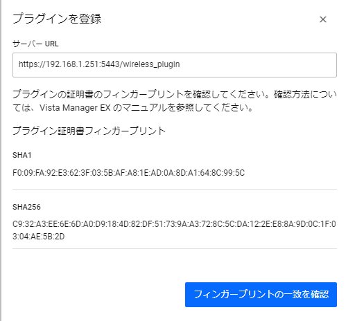 「フィンガープリントの一致を確認」ボタン | サーバーURLに対応するプラグインの情報を保存します。 |