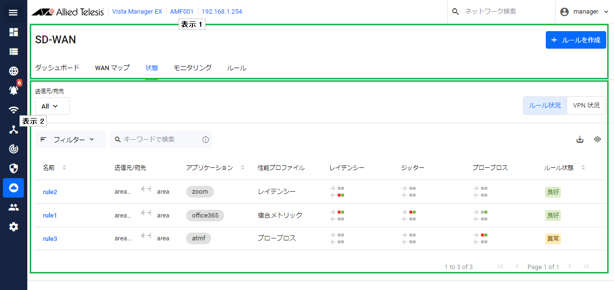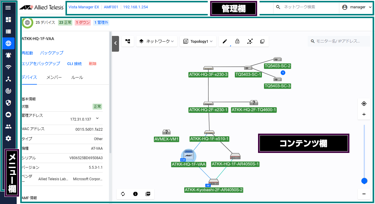 ウィンドウ構成 | AT-Vista Manager EXの大まかな画面構成を説明します。 |