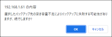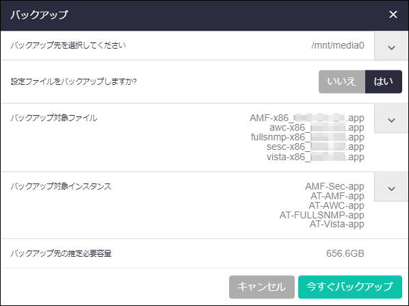 | バックアップ先の推定必要容量 | USBメモリーに必要な容量の推定値です。実際に作成されるサイズとは異なります。 バックアップ対象のアプリケーションが実行中の場合は、実際に使用されているストレージサイズをもとに算出されます。 停止済みの場合は、作成時に割り当てたストレージサイズをもとに算出されるため、大きく異なります。 |
