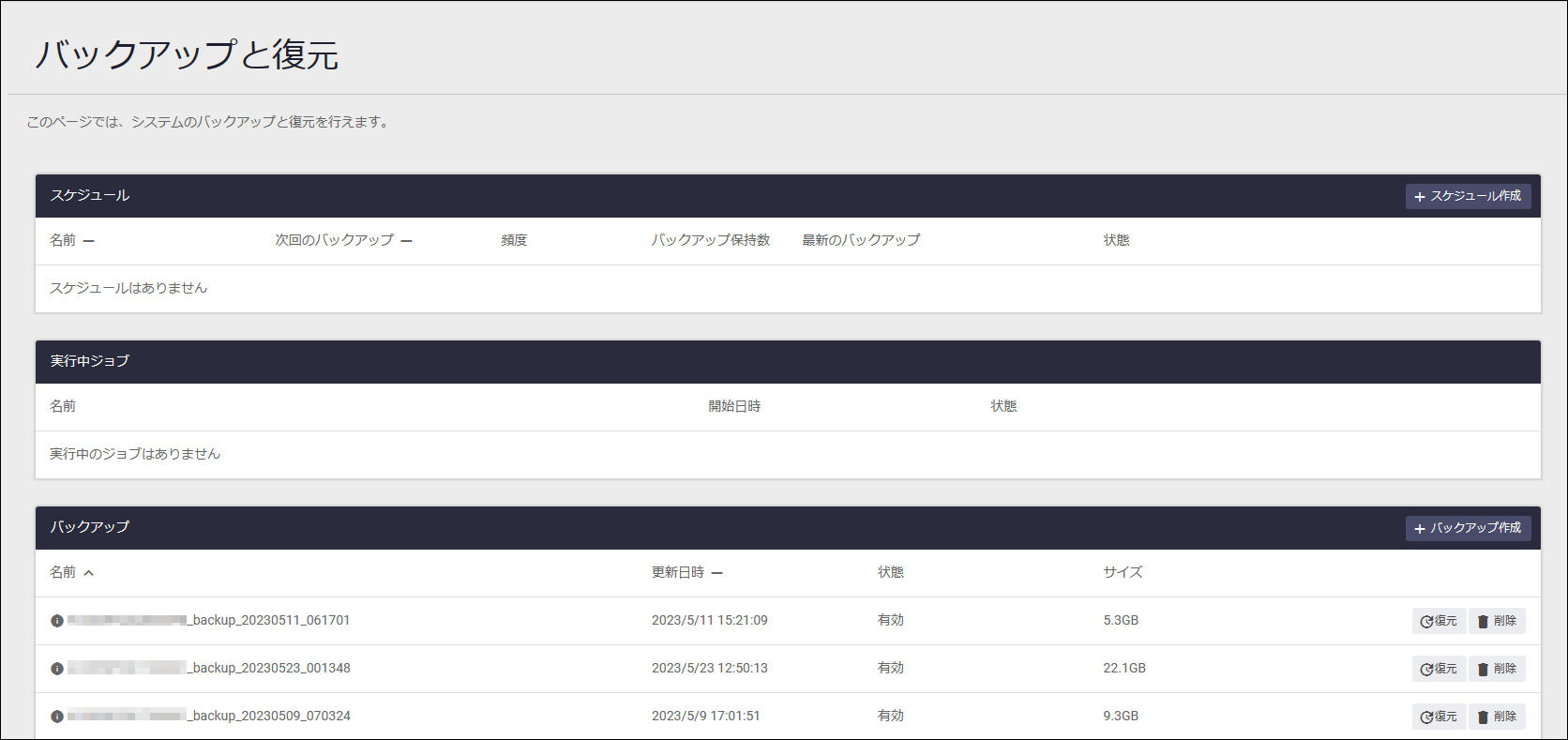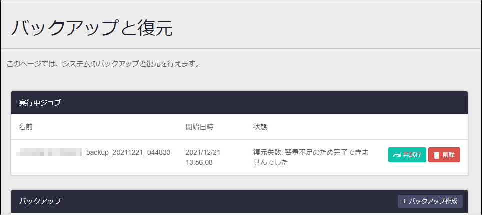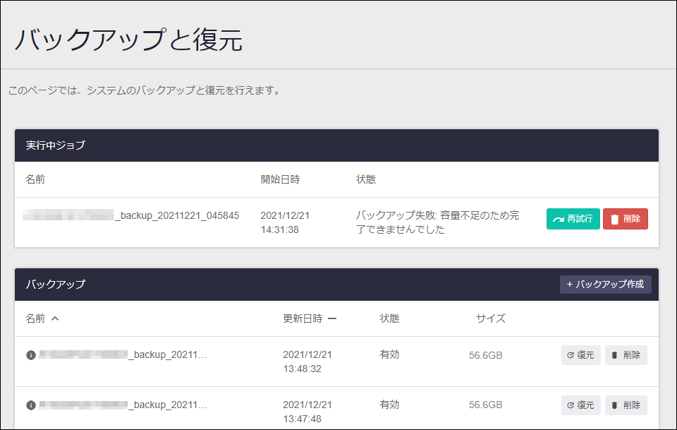 | ストレージの推定必要容量 | リストアする際に必要な、「システム」/「コンテナサービス」画面における「コンピュートノード」の「ストレージ」の空き容量です。 |