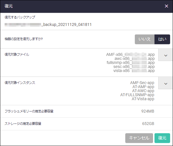 | 復元対象インスタンス | リストアするアプリケーションの設定(ライセンス、シリアル番号含む)を選択します。 リストア対象のアプリケーションが停止済みの場合は、アプリケーションの設定が上書きされます。 リストア対象のアプリケーションが実行中の場合は、メッセージが表示されリストアできません。アプリケーションを停止または削除してください。 |