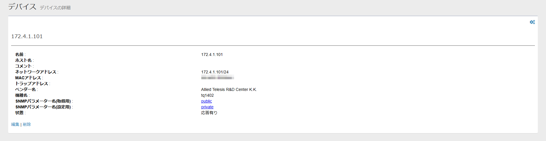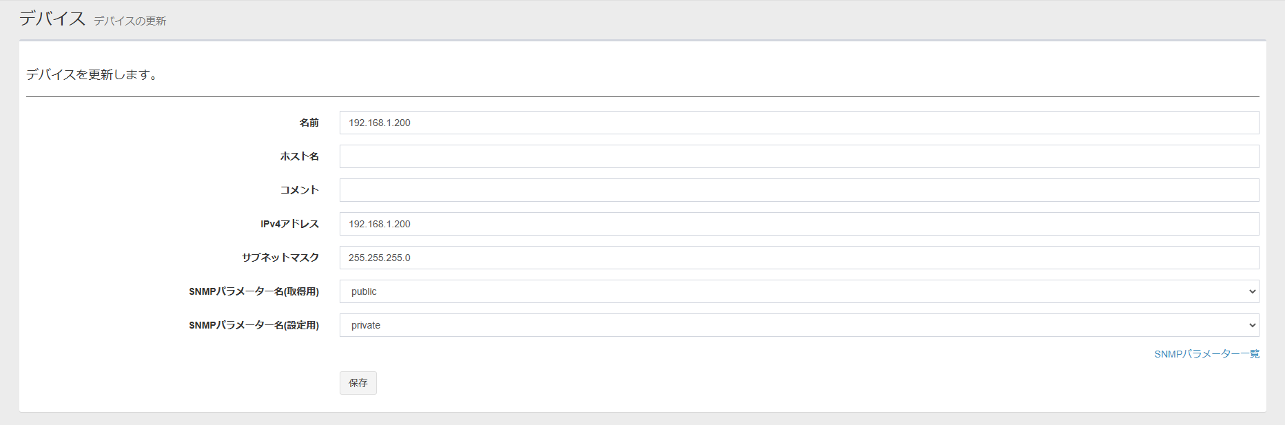 | SNMPパラメーター名(取得用) | SNMPでデバイスから情報を取得するときに使うGetパラメーター名。SNMPパラメーター名をクリックするとSNMPパラメーターの詳細が表示されます。 |