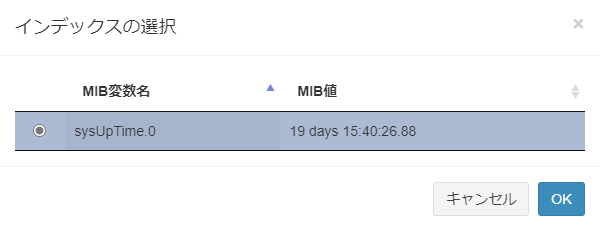 | OK | MIBツリーにて選択したMIBオブジェクトを追加します。 「インデックスを選択」ダイアログにて、該当のMIBノードに格納された情報のインデックスを選択します。 |