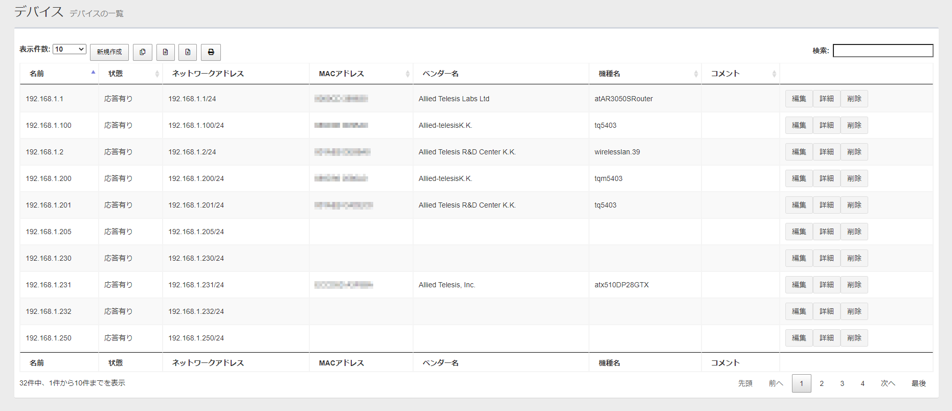 登録されたデバイスの名前、状態、ネットワークアドレス、MACアドレス、ベンダー名、機種名、コメントを、Webブラウザーのポップアップウィンドウまたは新規タブに一覧表示し、印刷ダイアログを表示します。 検索フィールドにより対象を絞り込むことができます。表示件数、ページは影響しません。 |