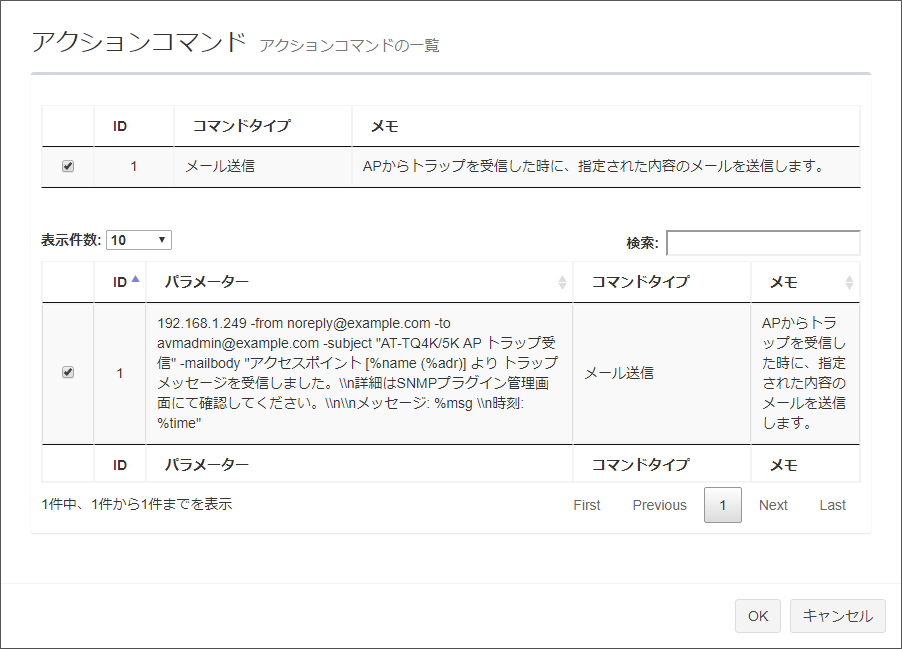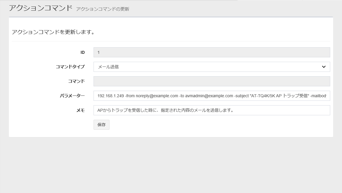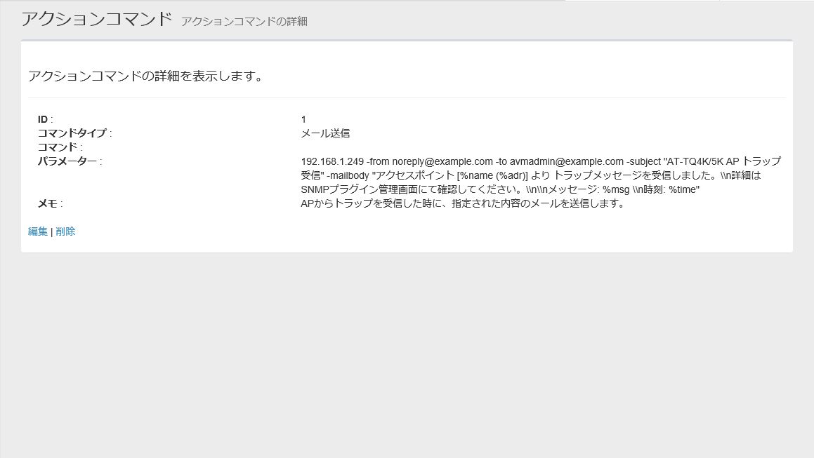 | タイムゾーン | 「アクションコマンド」の %time パラメーターで表示される時刻のタイムゾーンを設定します。プルダウンから該当するものを選択してください。 なおSNMPプラグインの各種ページ上で表示される時刻は、本設定が適用されずに閲覧しているPCのOSのタイムゾーン設定で表示されます。 |