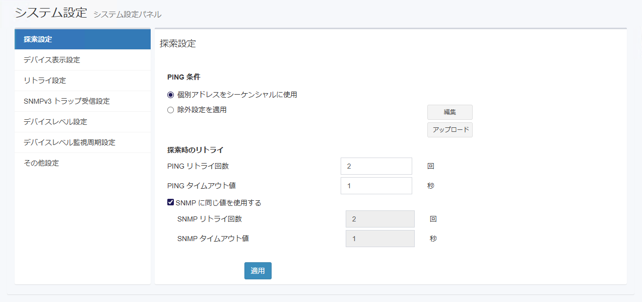 | 「適用」ボタン | 探索設定の変更内容を適用します。 |