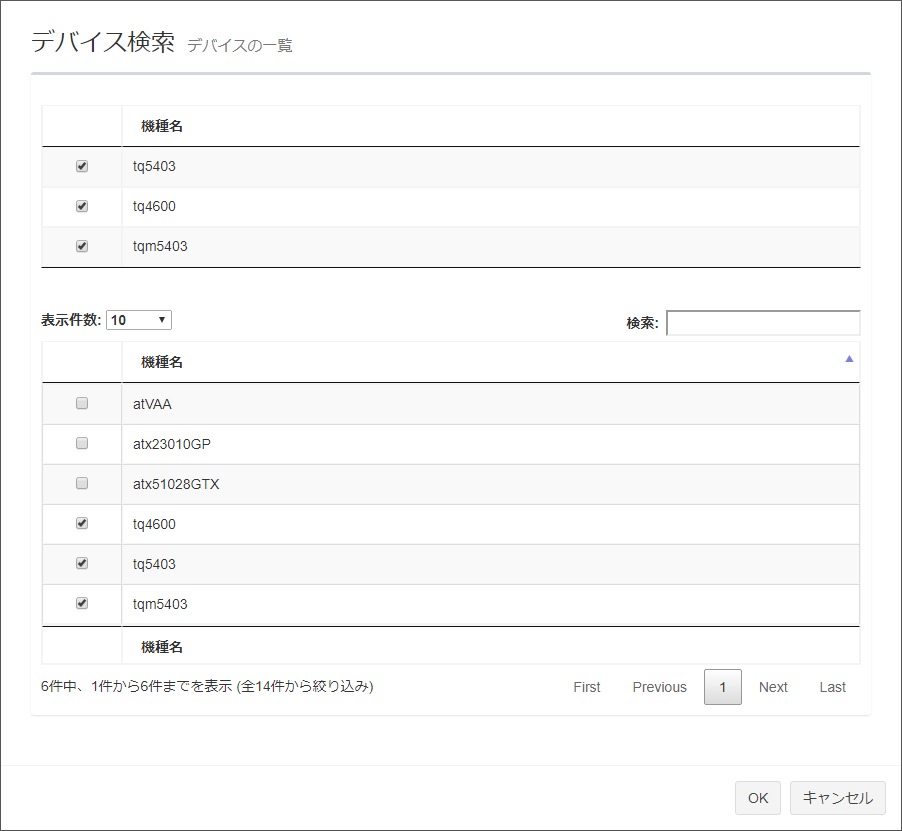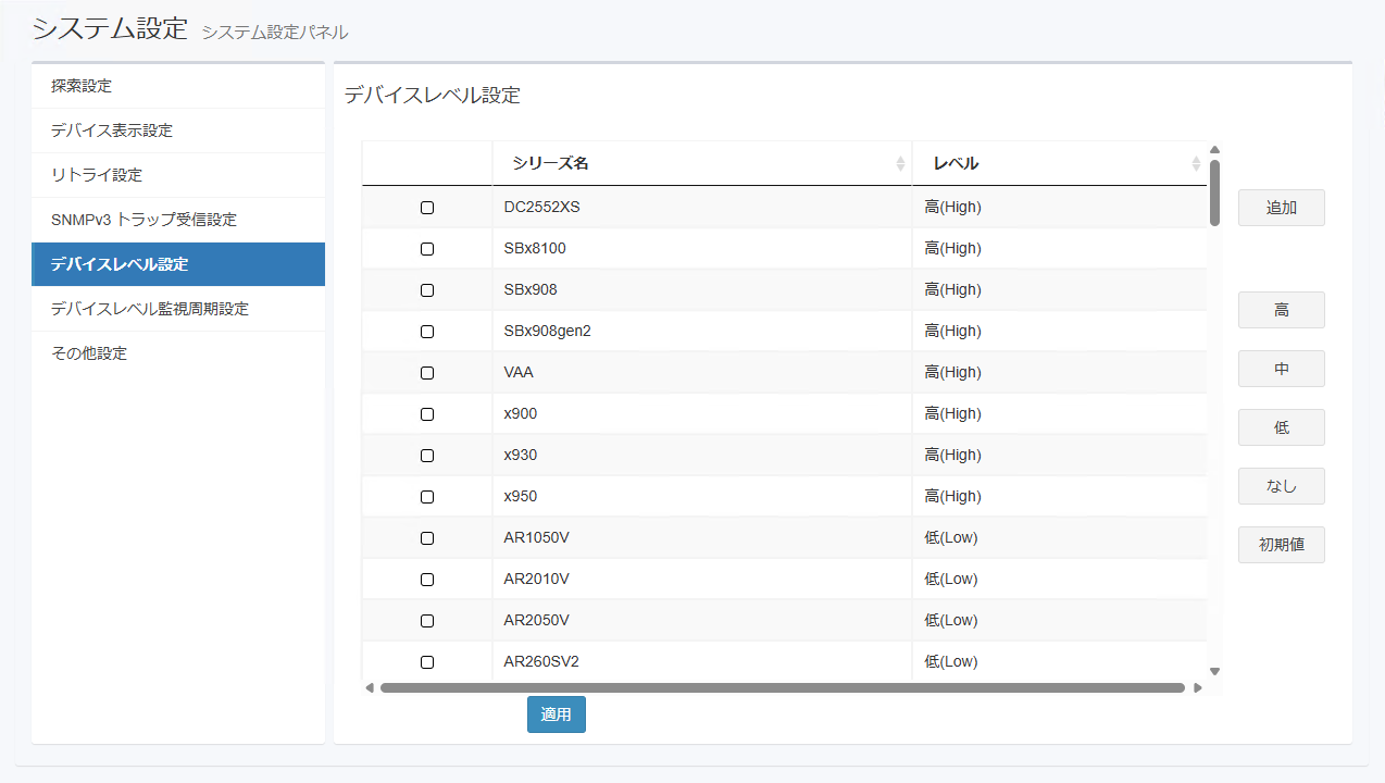 | 「高」、「中」、「低」、「なし」、「初期値」ボタン | 選択したシリーズに対して、デバイスレベルを設定します。 「初期値」を選択すると、シリーズごとのデフォルト設定に戻ります。「追加」ボタンから追加されたシリーズに対して「初期値」を選択すると、リストから削除されます(「なし」と同じ動作になります)。 |