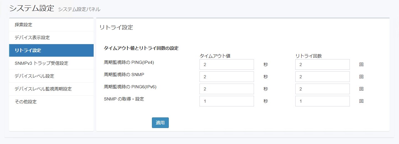 | タイムアウト値とリトライ回数の設定 | 周期監視時の PING(IPv4)、周期監視時の SNMP、周期監視時の PING6(IPv6)、SNMPの取得・設定に関して、タイムアウト値とリトライ回数を設定します。