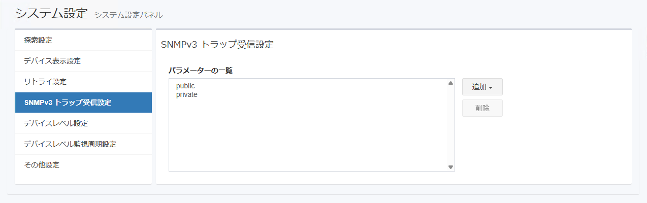 | パラメーターの一覧 | SNMPv3トラップを受信するのに使用するSNMPパラメーターの一覧が表示されます。 |