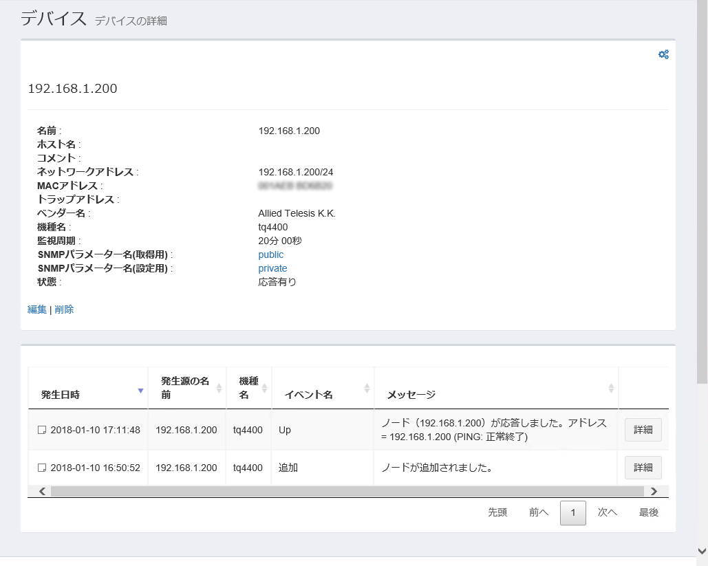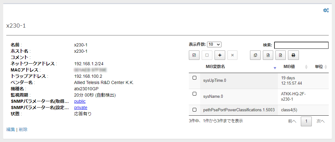 Note本製品では、デバイスのMACアドレスを標準MIBのdot1dBaseBridgeAddressから取得し、取得ができない場合は自動探索時に検出済みの他の機器のARPテーブルから取得します。