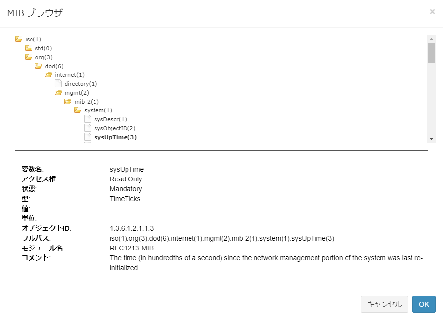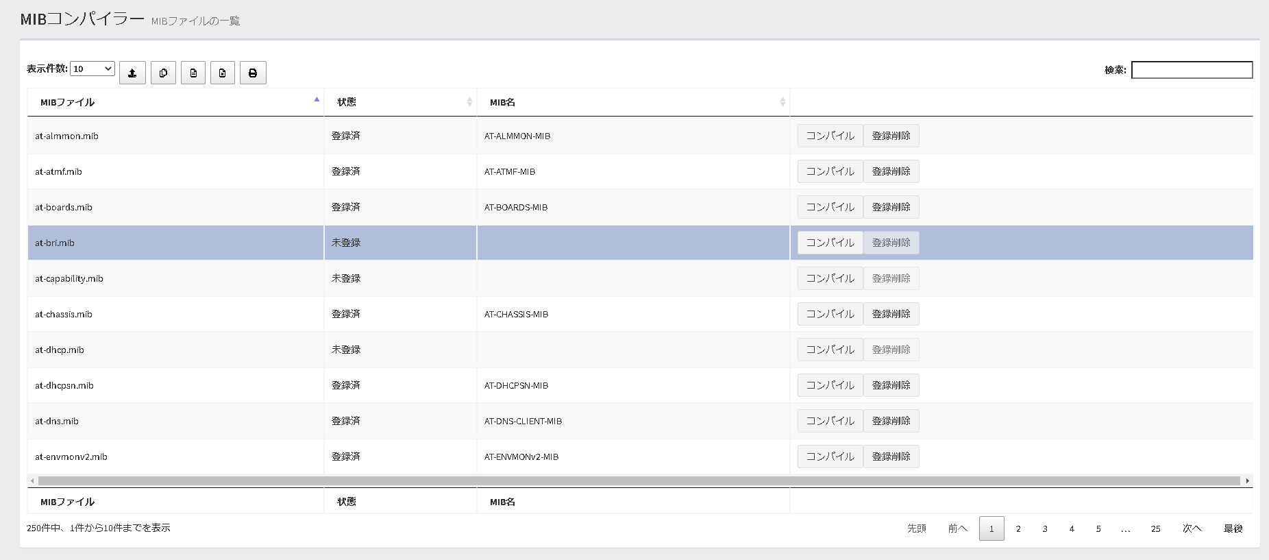 | 「登録削除」ボタン | MIBファイルを残したまま、MIBブラウザーに表示しないようにします。 一覧には「未登録」と表示され、MIBブラウザーには表示されません。 |