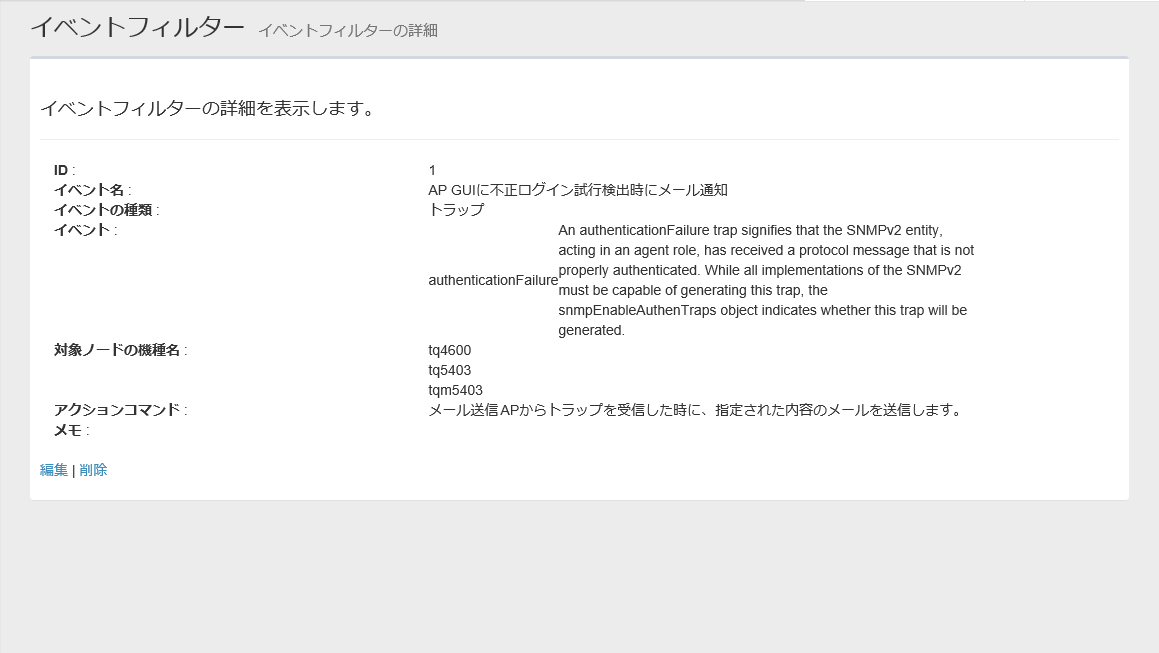| 「削除」ボタン | MIBファイルを削除して、SNMPプラグインからすべての情報が除去されます。 再度使用したい場合はアップロードからやり直してください。 Note削除できるのはアップロードしたMIBファイルのみです。インストール時に用意されたMIBファイルは、「削除」ボタンが表示されません。 |