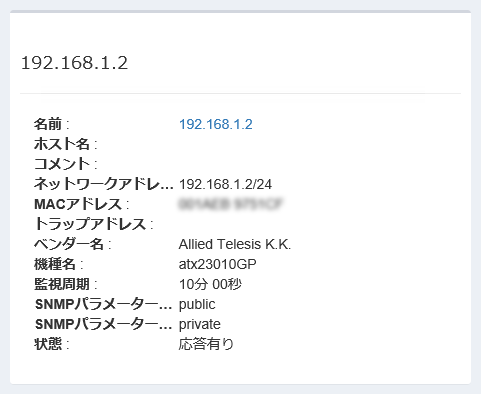 このためdot1dBaseBridgeAddressをサポートしていない機器でMACアドレスを登録させる場合は、該当機器のIPアドレスを他の機器より大きな値にして、該当機器が後から検出されるようにしてください。