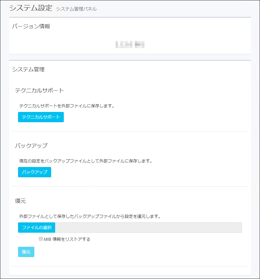 | 「テクニカルサポート」ボタン | テクニカルサポート用のファイルが出力されます。 トラブルシューティング時など、内部情報の確認が必要な場合を想定したものですので、ご使用に際しては弊社技術担当にご相談ください。 |