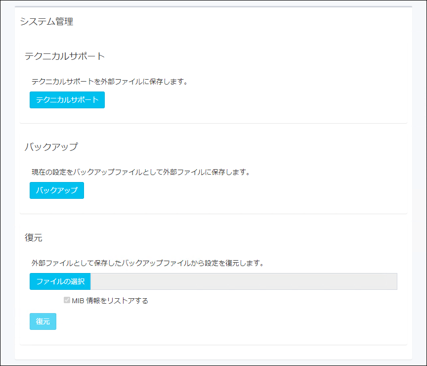 | 「復元」ボタン | 外部ファイルとして保存したバックアップファイルから設定を復元します。NoteAVM EX 3.15.0以前のバックアップファイルには、各デバイスのポート情報などが含まれておりません。そのためAVM EX 3.15.0以前のバックアップファイルをリストアした直後は、ネットワークツリーで各デバイスのポート情報などが表示されませんので、各サブネットで自動探索を実行してください。