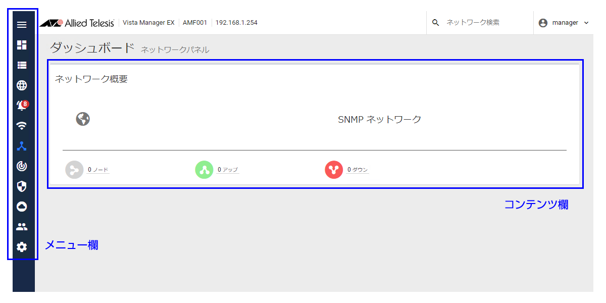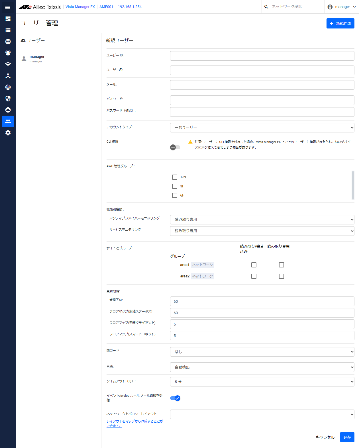| 一般ユーザーアカウント | 一部のSNMP管理機能の設定、閲覧ができます。 ノード情報の閲覧、サブネットの自動探索の実行 |