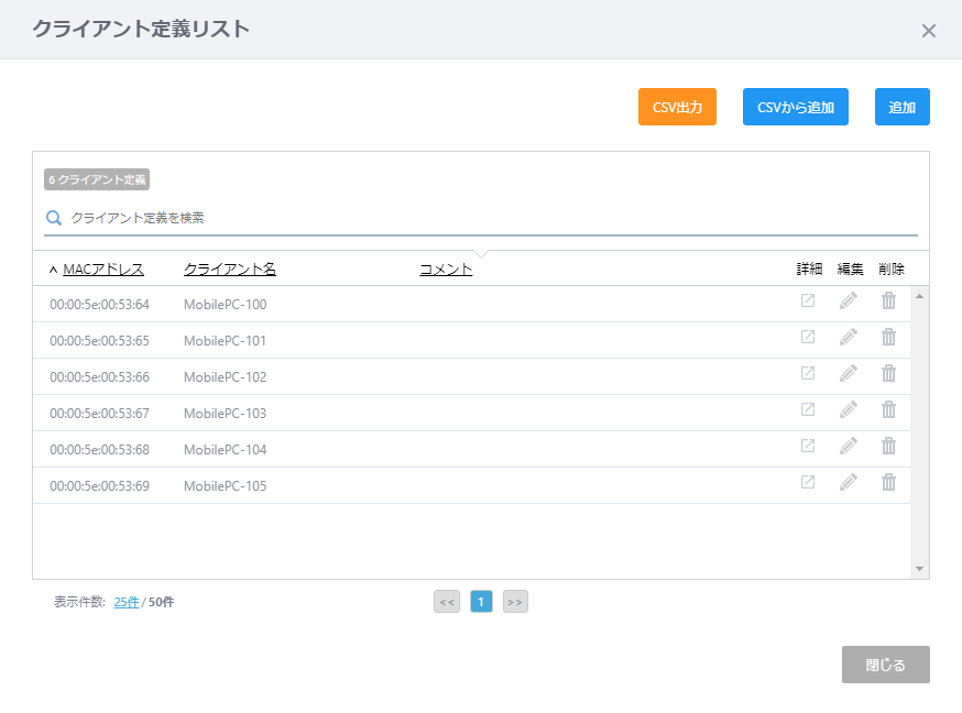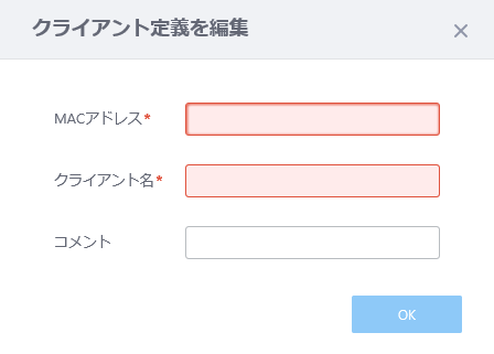| クライアント定義を検索 | 登録された無線クライアント名の定義の検索を行えます。現在の表示対象のうち、「MACアドレス」、「クライアント名」または「コメント」に、本フィールドに入力された文字列を含む項目を表示します。 検索後、すべてが表示されているリストに戻る場合は空欄にします。 Note大文字小文字を区別しますのでご注意ください。 |