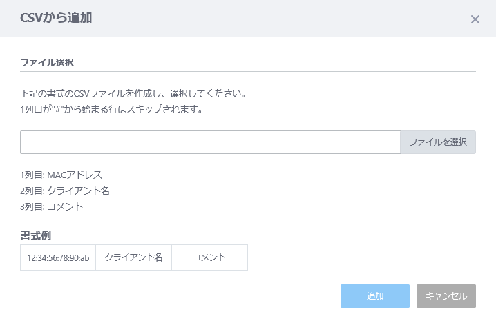 | 「CSVから追加」ボタン | 「CSVから追加」ダイアログが表示されます。![]()