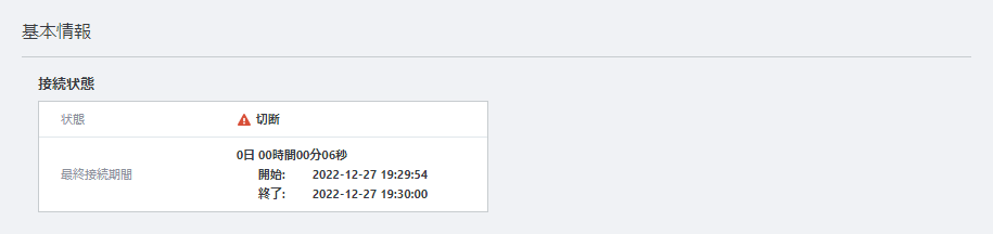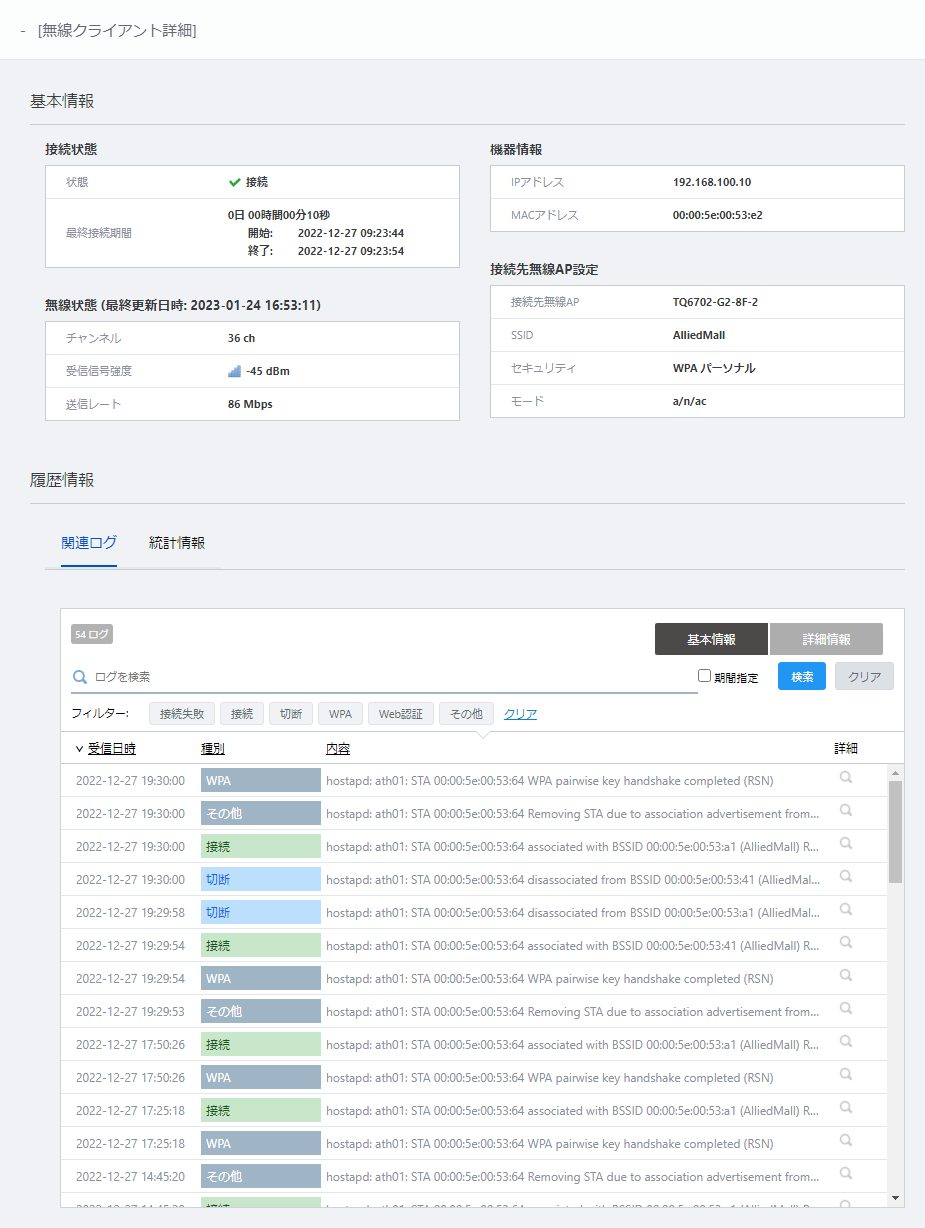 | 最終接続期間 | 該当の無線クライアントが管理下の無線APに最後に接続していた際の接続時間、接続開始日時、接続終了日時を表示します。 |