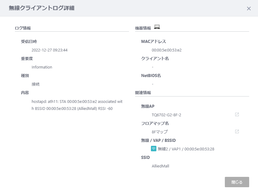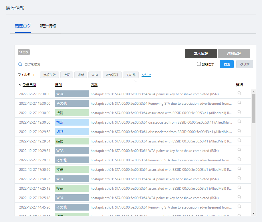 | 無線 / VAP / BSSID | 該当無線クライアントが接続、切断、または接続に失敗した無線バンド、VAP番号と該当VAPのBSSIDを表示します。 |