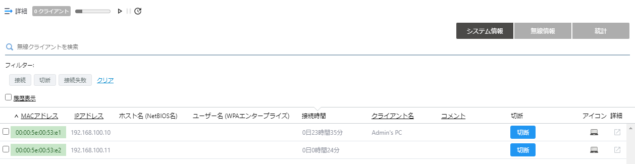 | フィルター | 無線クライアント一覧を無線クライアントの状態で絞り込みます。