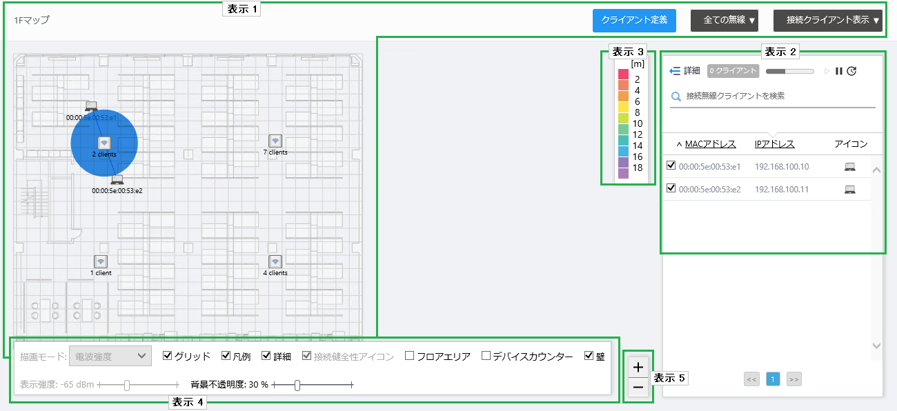 | チェックボックス | フロアマップに表示する無線クライアントの選択を行います。 チェックボックスにチェックを入れると、無線クライアントが接続している無線APのアイコンの周囲に、無線クライアントのアイコンとMACアドレスを表示します。 |