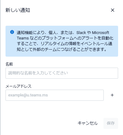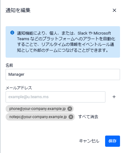 メールアドレス | 通知先に登録されたメールアドレスを入力します。入力後、右側の「+」ボタンをクリックすると、メールアドレスが登録されます。 1つの通知先には複数のメールアドレスを関連付けることができます。関連付けるメールアドレスを追加する場合は最大10件までです。 登録されたメールアドレスは入力欄の下に表示されます。登録されたメールアドレスの右側の×ボタンをクリックすると削除できます。複数のメールアドレスが登録されている場合は、登録メールアドレス末尾の「すべて消去」をクリックすると、すべて削除できます。 Noteいずれかのアカウントに関連付けられたメールアドレスは登録できません。他の通知先と重複して同じメールアドレスを登録することは可能です。 |