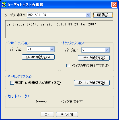 ターゲットホストのホスト名か IPアドレスを指定します。「確認」ボタンをクリックすると、指定したエージェントの MIB 変数 sysDescr の内容を確認できます。指定したエージェントが目的のエージェントであることを確認したら、「OK」ボタンをクリックしてください。