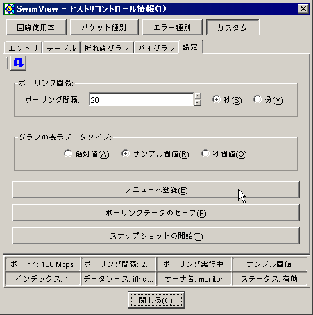 ヒストリー情報の場合、RMON エージェント自身がデータ収集を行い、SwimView はそのデータを取り出して表示するだけであるため、SwimView で設定するポーリング間隔や表示データタイプの意味が統計情報などとは少し違います。ポーリング間隔は、単に RMON からデータを取り出す間隔を示します。