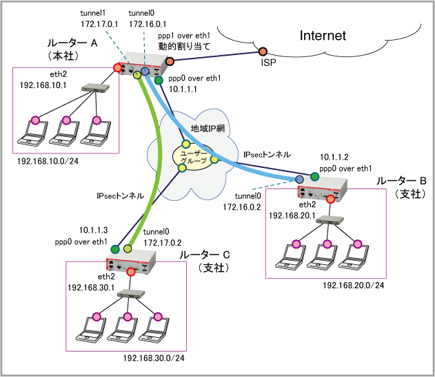 | WAN側(ppp0)IPアドレス | 10.1.1.1/32 | 10.1.1.2/32 | 10.1.1.3/32 |