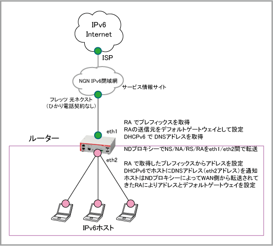 | LAN側(eth2)IPv6アドレス | ルーター通知(RA)で取得したIPv6プレフィックスにもとづいて設定 |