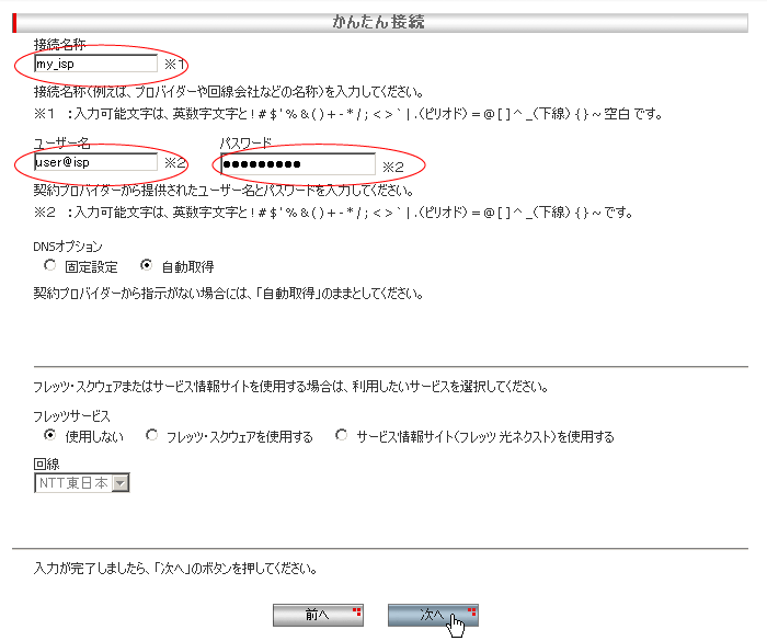 [接続名称]にmy_isp (特に決まりは無いので任意の文字列でかまいません。)と入力し、[ユーザー名][パスワード]にISPから提供された内容を入力して、[次へ]を押します。