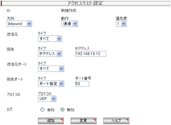 - DNSサーバーへの通信(UDP、53番)を通過させるため、[アクセスリスト設定]に次の設定を行い[追加]を押します。