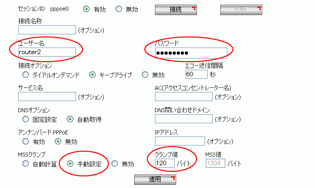 pppoe0の[ユーザー名][パスワード]に、CUGサービスから提供された内容を入力します。[MSSクランプ]を「手動設定」にします。[クランプ値]を40から120に変更して[適用]を押します。