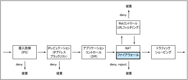 Note - アプリケーションコントロール(DPI)機能では、各アプリケーション固有の通信パターンを検出するために一定量のパケットを受信してそのデータ部分を検査する必要がありますが、ファイアウォールはその仕様として初期設定ですべてのパケットを破棄するため、ファイアウォールとアプリケーションコントロール(DPI)を併用する場合は注意が必要です。詳しくは「UTM」/「アプリケーションコントロール(DPI)」をご覧ください。