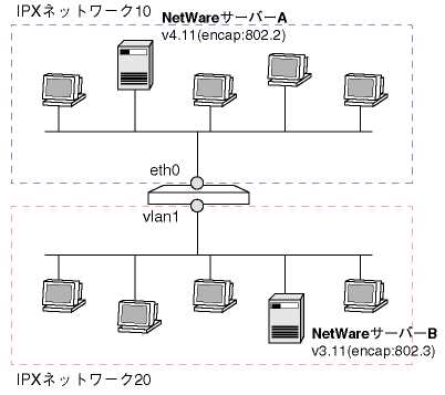 Note - 同一Ethernetセグメントであっても、フレームタイプが異なれば別のネットワークであると見なすことができます。そのため、1つのEthernet、VLANインターフェース上には、フレームタイプの異なる4つのIPXネットワークを設定することができます。