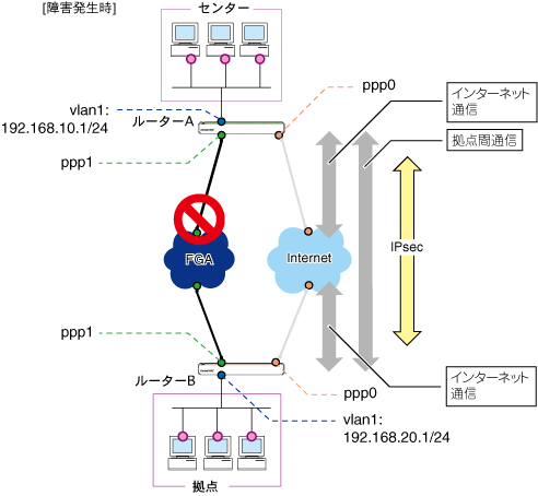 PPPoEセッションを2本使い、拠点間通信にフレッツグループアクセス(以下「FGA」と省略します)を利用し、バックアップ回線としてインターネットVPNを利用するネットワークを構築します。