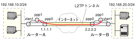 図では、ルーターAとルーターBがL2TPを利用して仮想的なPPPセッションを張っている様子を示しています。各ルーターは、インターネット(ISP)接続用とルーター間接続用の2つのPPPインターフェースを持つことになります。