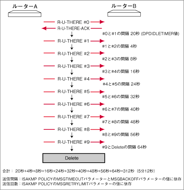 | 再試行の設定数を超えたためR-U-THEREACKメッセージを受け取らない場合 | 通信が断絶していると考え、IPsec SA、ISAKMP SAを削除する |