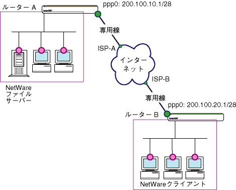 L2TPを使って、インターネット経由でIPXネットワーク同士を接続します。両側のルーターにグローバルアドレスが固定的に設定されている場合の基本設定です。なお、この例ではL2TPによるLAN間接続の基本設定を示すため、拠点間のIP通信、および、各拠点からのインターネットアクセスについては考慮していません。インターネットを安価な交換回線網としてのみとらえています。
