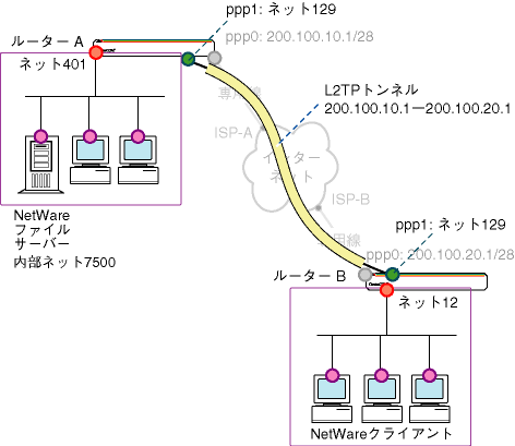 L2TPによるLAN間接続(IPX。両側アドレス固定。インターネットアクセスなし)